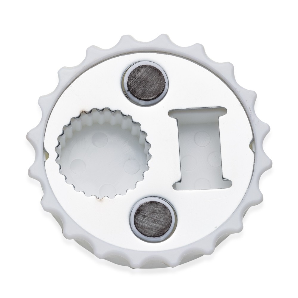 Abridor formato tampa de garrafa com imã para geladeira, contém dois tipos de abridores de garrafa. Especificações: - Altura  7,7 cm - Largura  7,7 cm - Medidas aproximadas para gravação(CxL)  6,6 cm x 6,6 cm - Peso aproximado(g)  50