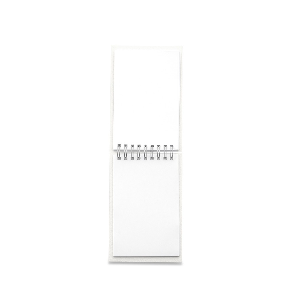 Bloco de anotações com capa pet sublimática e trilho de ferro. Possui aproximadamente 100 folhas brancas sem pauta. Informações do fornecedor para sublimação: temperatura 200ºC, tempo 25/30 segundos.