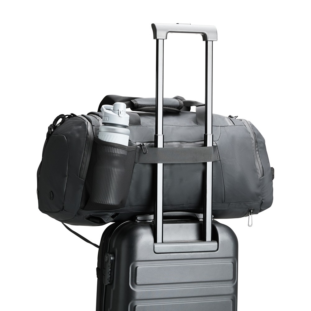 Bolsa confeccionada em filme sintético tipo couro impermeável com capacidade de até 35 litros. Possui compartimento interno amplo dois bolsos em tela e fechamento em zíper, além de quatro bolsos externos de tamanhos variados e fechamento em zíper e um em tela com elástico. Apresenta alças de mão com suporte de juntura e um par de alças ocultas na parte inferior da bolsa, que permitem seu uso como mochila. Contém alça transversal removível. Especificações: - Altura  23 cm - Largura  50 cm - Profundidade  25 cm - Medidas aproximadas para gravação(CxL)  16 cm x 32 cm - Peso aproximado(g)  1054