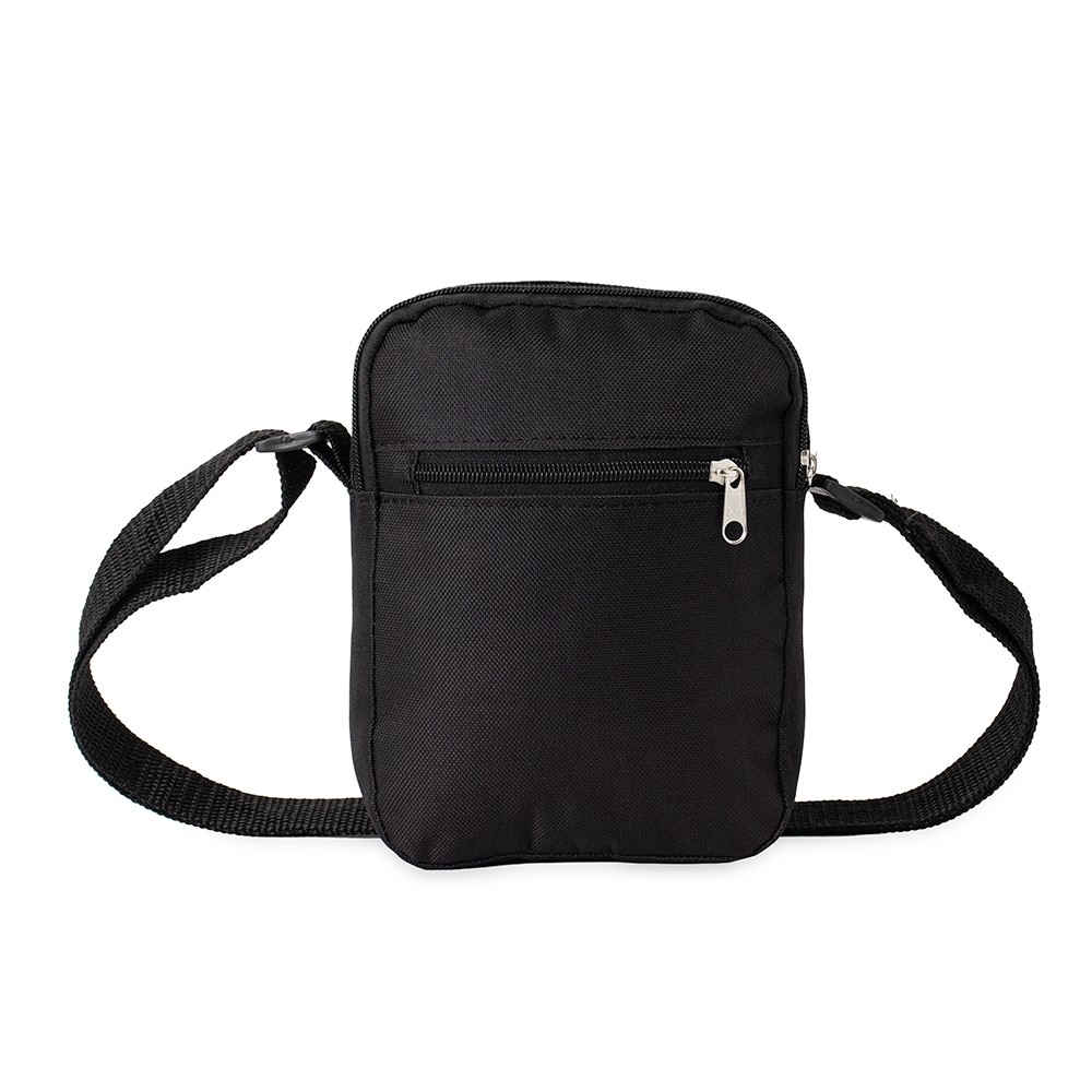 Bolsa de ombro em nylon com dois compartimentos, sendo o principal com bolso interno telado. Possui alça com opção de regulagem.
