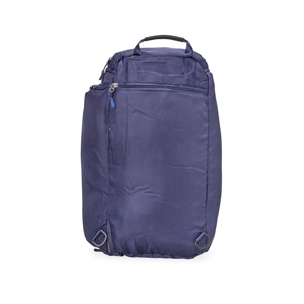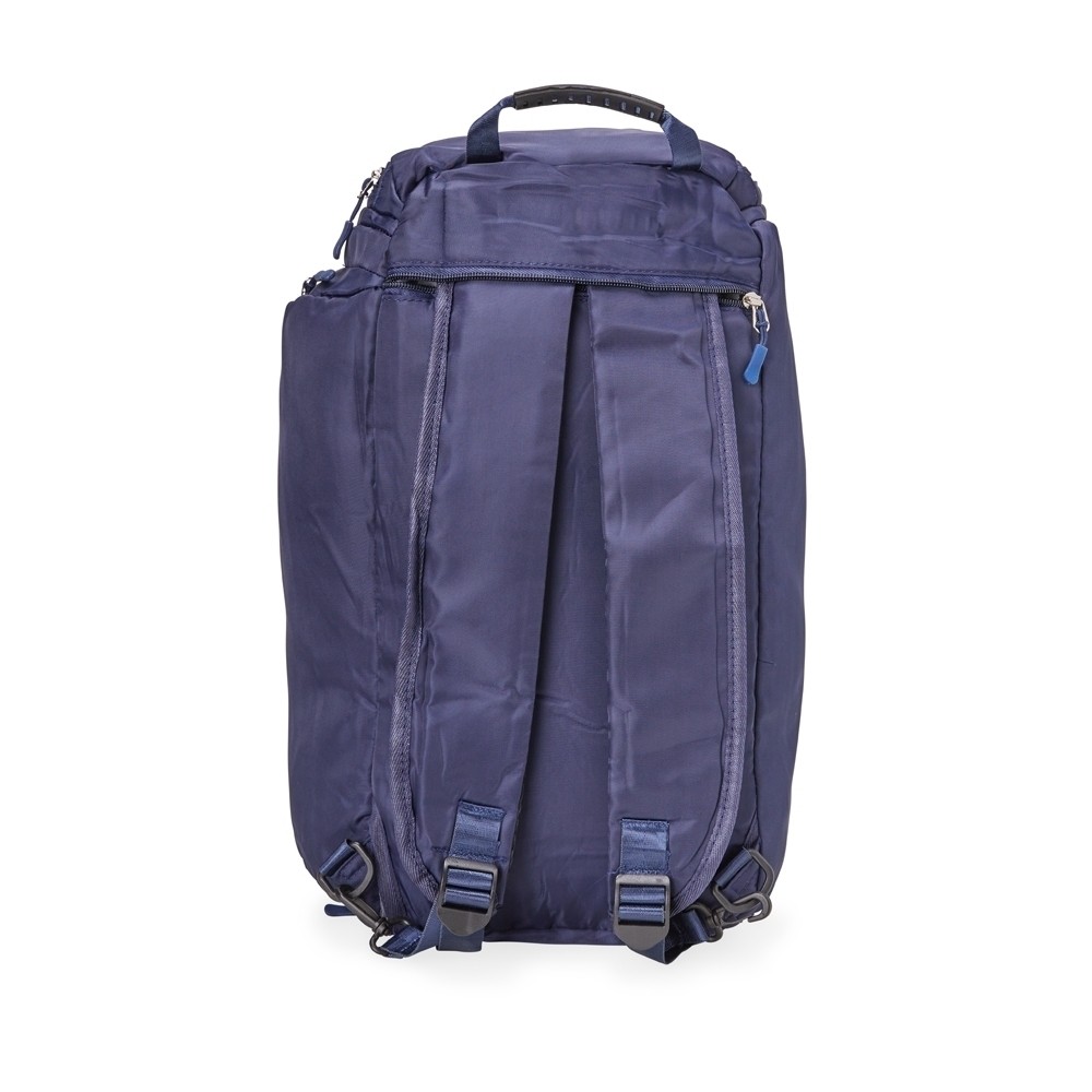Bolsa esportiva de 33 litros em poliéster de impacto impermeável com cinco compartimentos, sendo três deles exclusivos para tênis, itens molhados e armazenamento das alças de costas. Com alça transversal removível e alça de mãos com suporte de juntura, a bolsa contém alças de compensação e alças para as costas ocultas no compartimento inferior, podendo ser transportada como mochila.