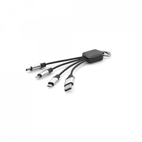 Cabo USB de carregamento rápido 3 em 1 com corpo em PET 100% reciclado Cabo USB de carregamento rápido 4 em 1 com corpo em PET 100% reciclado. Contém uma porta de USB-A de entrada e uma USB-C, uma micro-USB e uma lightning de saída. Adequado para carregar dispositivos móveis. Fornecido em caixa presente de papel kraft reciclado. 100 x 40 mm | Caixa: 70 x 19 x 165 mm