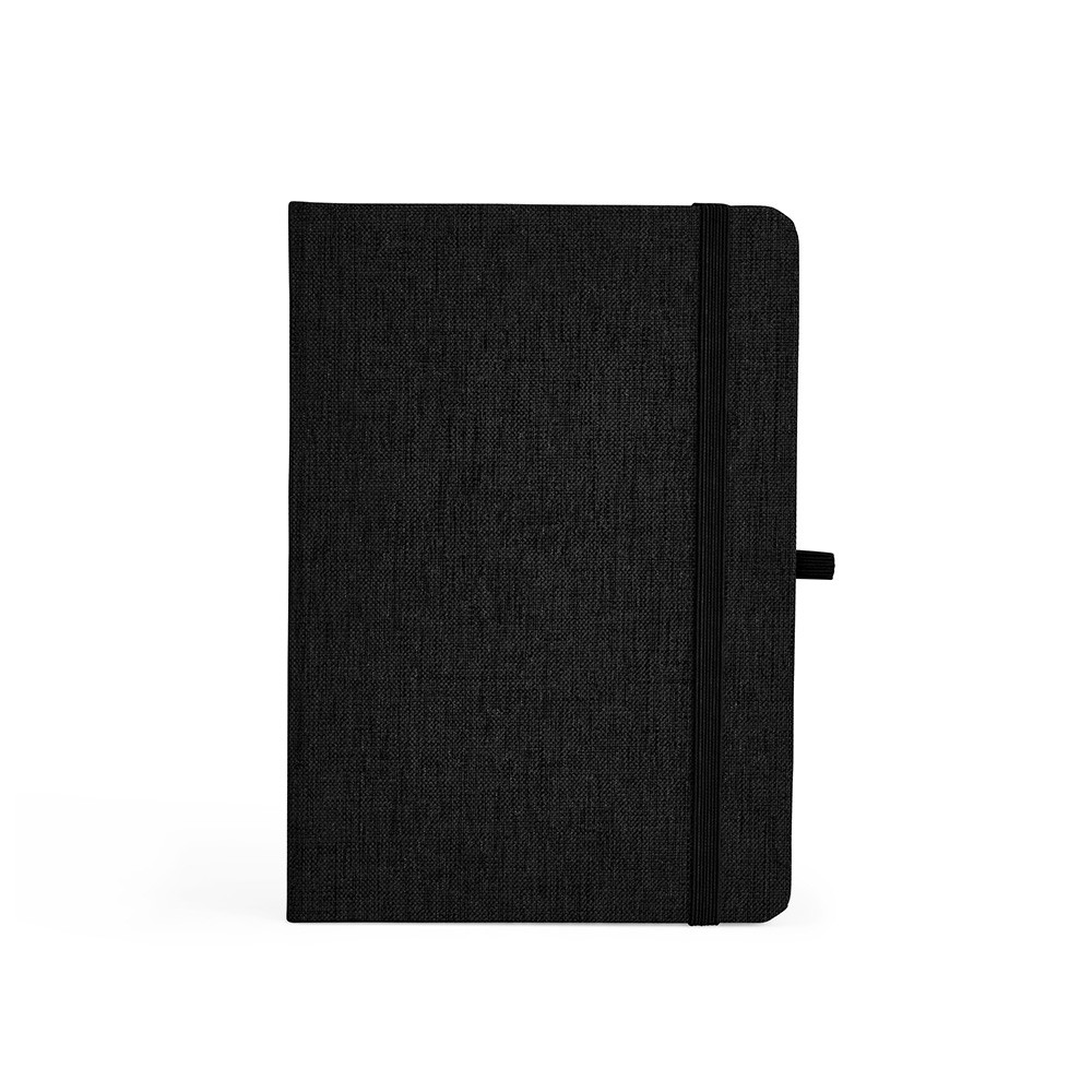 Caderneta feita de linho com porta caneta elástico, marcador de página em cetim e fita elástica para fechar. Contém aproximadamente 80 folhas brancas pautadas. Especificações: - Altura  17,5 cm - Largura  12,4 cm - Espessura  1,3 cm - Medidas aproximadas para gravação(CxL)  13 cm x 8 cm - Peso aproximado(g)  174