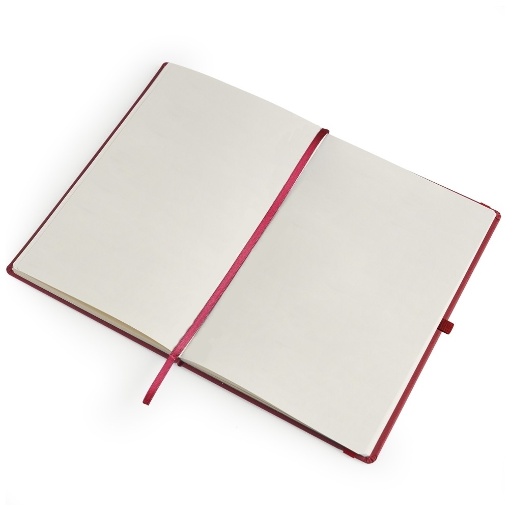 Caderneta em percalux com marcador de página em cetim e fita elástica para fechar. Contém aproximadamente 80 folhas sem pauta.