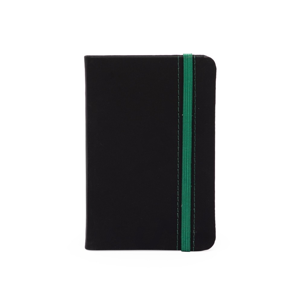 Caderneta emborrachada com marcador de página em cetim e fita elástica de nylon para fechar. Contém aproximadamente 78 folhas marfim pautadas.