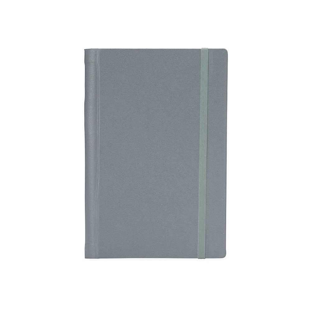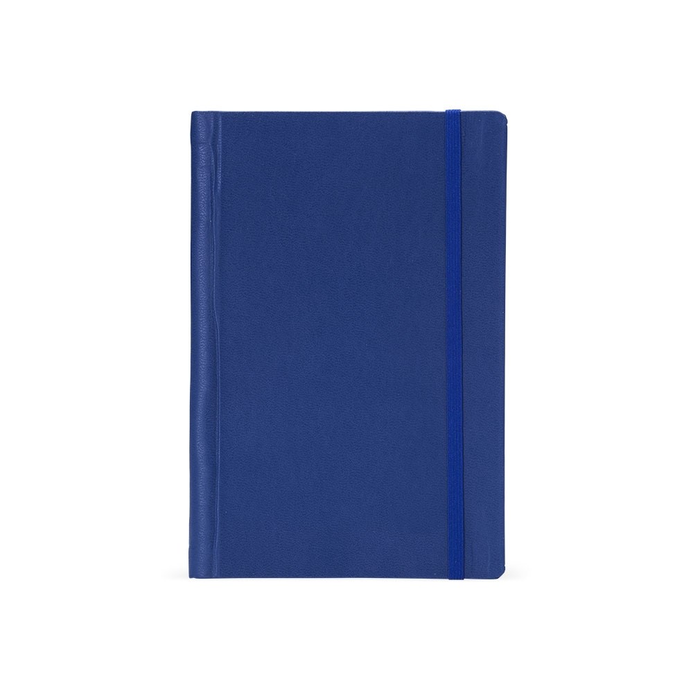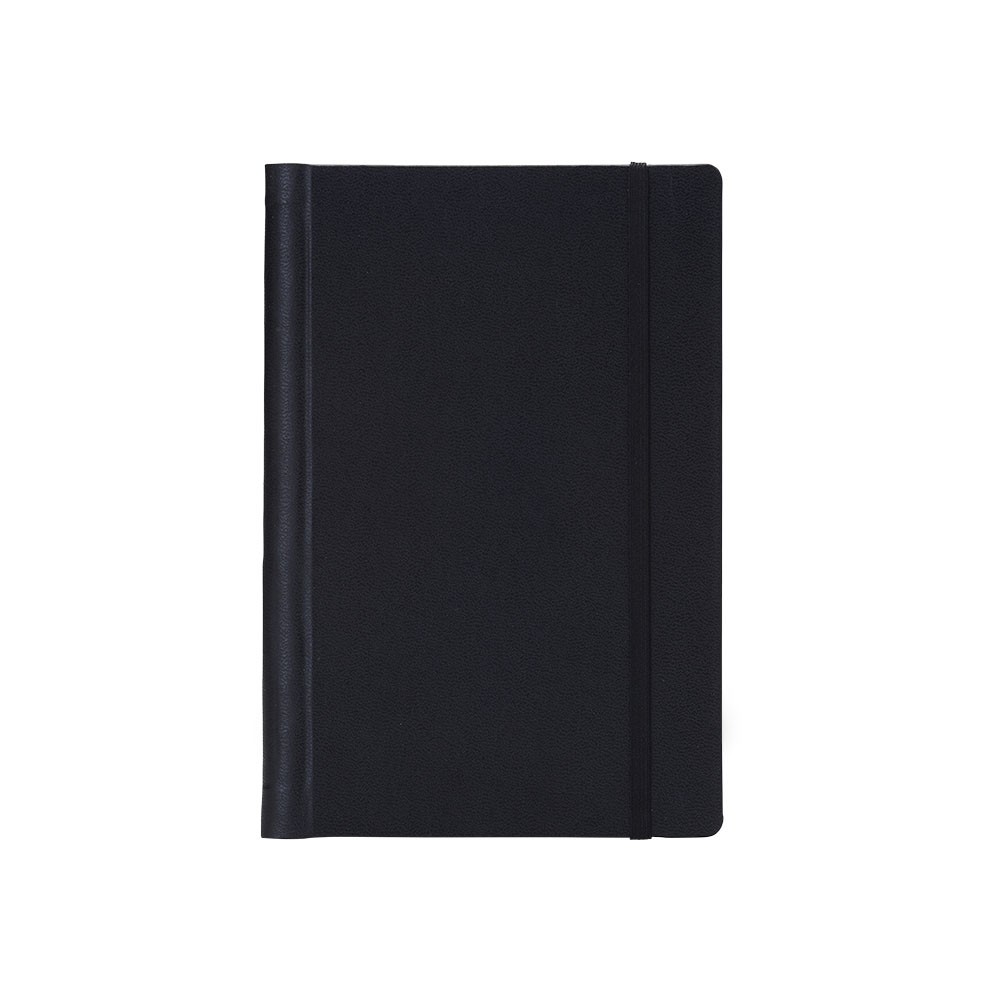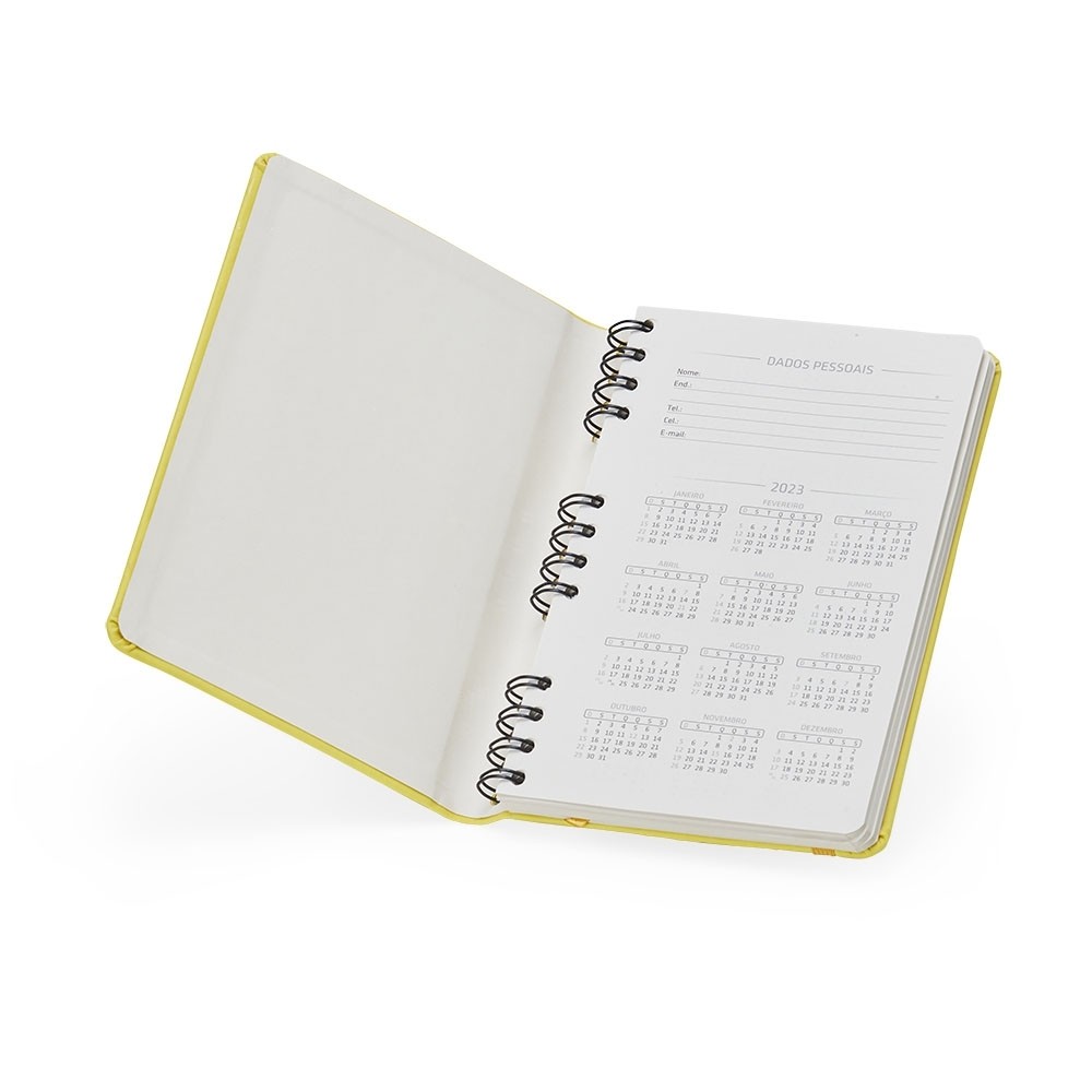 Caderneta emborrachada com wire-o, elástico para lacre e marcador de página em cetim. Possui páginas para dados pessoais, calendário de 2024 à 2026, página de contatos e aproximadamente 100 páginas em marfim com pauta.