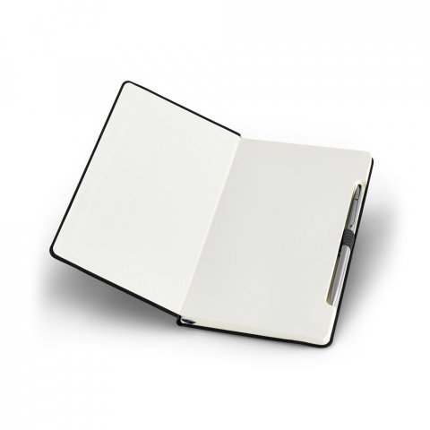 Caderno A5 de capa dura em c. sintético. Contém 192 páginas lisas, fita separadora, elástico e suporte para esferográfica. Incluso esferográfica de metal com escrita em azul. Fornecida com caixa presente. 139 x 216 mm | Caixa: 145 x 220 x 15 mm