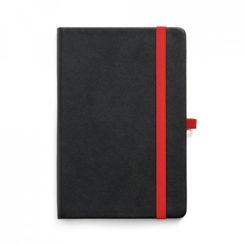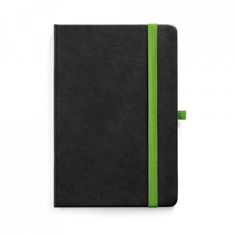 Caderno A5 de capa dura em PU com substrato colorido permitindo a gravação a laser da cor do elástico. Contém 160 páginas pautadas, elástico, fita separadora, suporte para esferográfica (não inclusa) e bolso em papel na parte traseira da capa. 140 x 210 mm