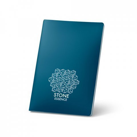 Caderno A5 de capa flexível em papel pedra (620g/m²), resistente à água. Contém 64 folhas brancas lisas (120g/m²) também em papel pedra. 140 x 210 mm