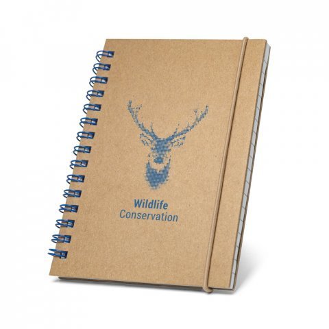Caderno de bolso espiral de capa dura em cartão. Contém 120 páginas pautadas em papel 100% reciclado e elástico. 100 x 140 mm