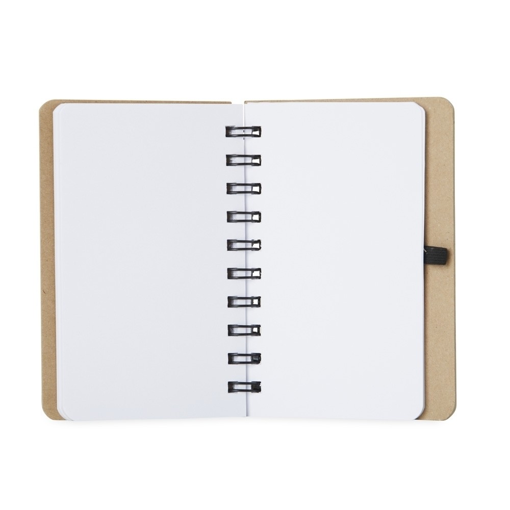 Caderno capa dura em kraft com wire-o e porta caneta. Contém aproximadamente 100 páginas não pautadas na cor branca.