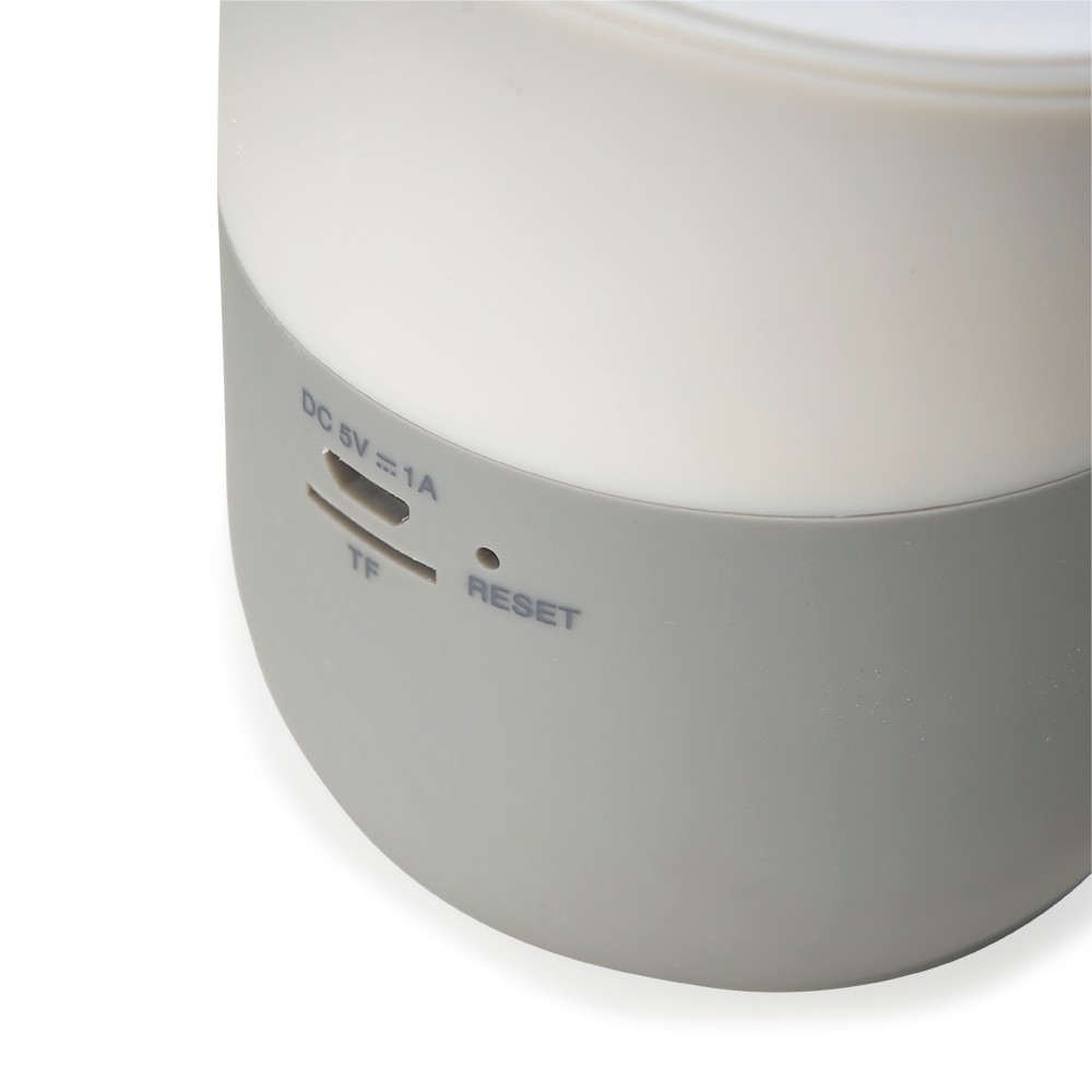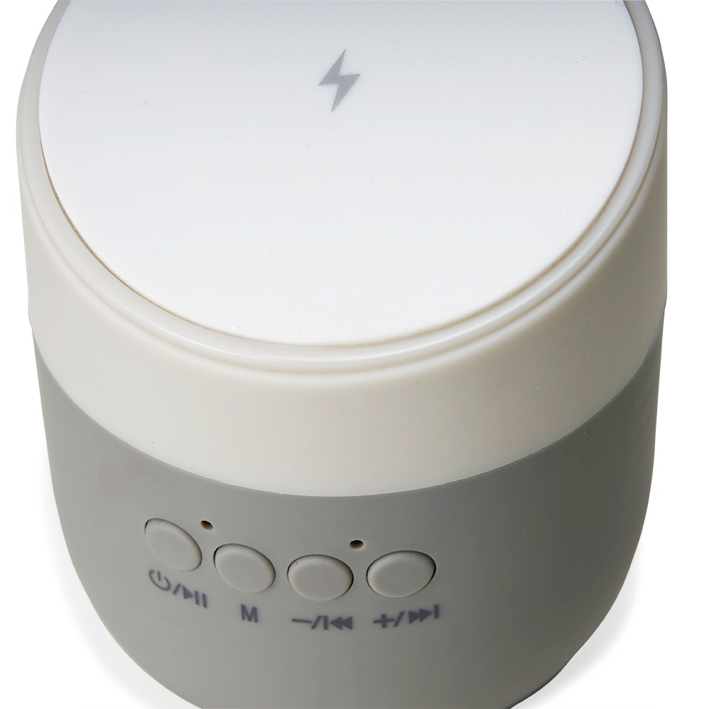 Caixa de som sem fio com estrutura em plástico com base emborrachada na parte inferior e área para encaixe de aparelhos compatíveis com a tecnologia Qi, possibilitando a recarga por indução. Possui entrada para cartão TF (micros) e painel frontal com botões de controle para a reprodução de arquivos MP3. Acompanha cabo micro-USB para recarga.