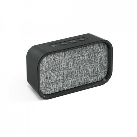 Caixa de som em ABS com microfone e autonomia de 2h Caixa de som portátil com microfone, em ABS, tecido em poliéster e acabamento emborrachado. Possui transmissão sem fios BT v4.2, potência de 3W/4Ω, ligação stereo 3,5 mm, leitor de cartões TF. A coluna tem autonomia, aproximada, de 2h. Função para atender chamadas, controle de volume, conexão à playlist do dispositivo móvel e rádio FM. Incluso cabo USB para carregar. Fornecida em caixa presente. 140 x 80 x 45 mm | Caixa: 160 x 82 x 60 mm