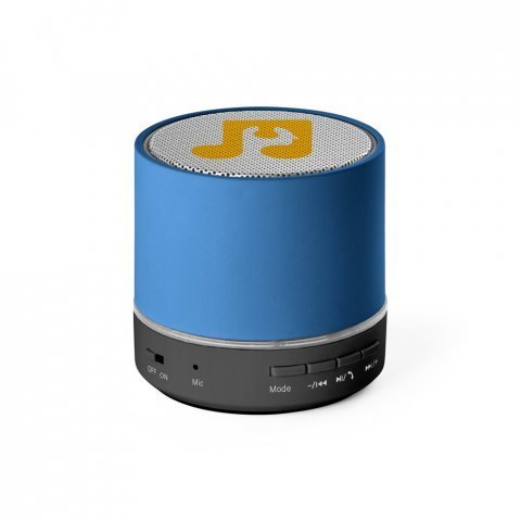 Caixa de som portátil em ABS 100% reciclado com microfone e autonomia de 4h30 Caixa de som portátil com microfone, em ABS 100% reciclado. Possui transmissão sem fios BT 5.3, potência de 3W, bateria com 400 mAh e autonomia, aproximada, de 4h30. Permite as funções de atender chamadas, leitor de cartões microSD, entrada AUX e reprodução automática via porta USB-A. Incluso cabo de carregamento USB-C. Fornecido em caixa presente de papel kraft reciclado que pode ser reutilizada como suporte de celular. A grelha é fornecida solta para pedidos não personalizados. ø60 x 58 mm | Caixa: 65 x 63 x 75 mm
