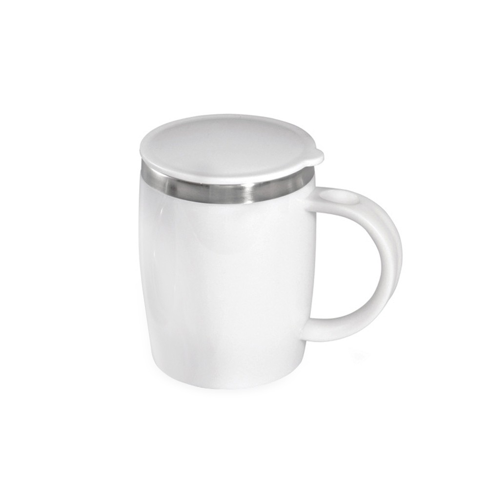 Caneca plástica com área interna de inox, capacidade de 400ml. A caneca possui tampa de encaixe com borracha de vedação e “tapete” antiderrapante na área inferior. Especificações: - Altura  12,5 cm - Largura  13 cm - Peso aproximado(g)  199