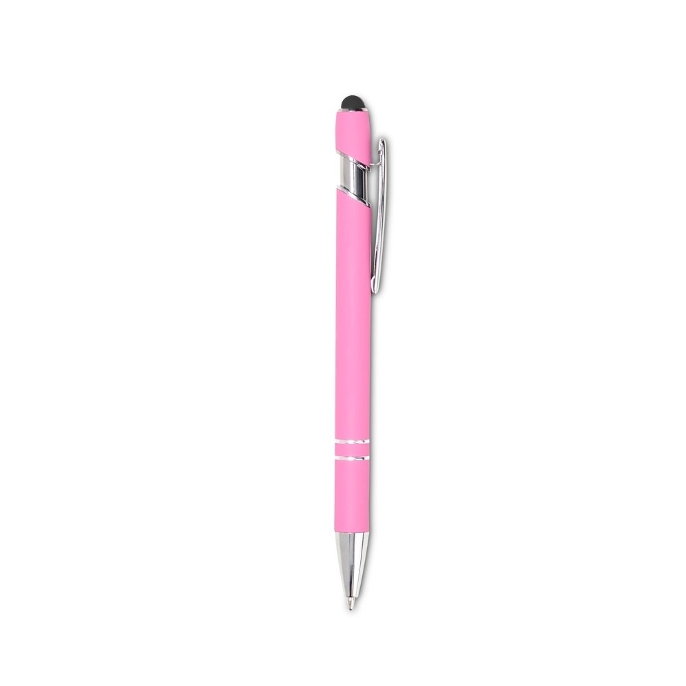 Caneta touch screen metálica com acabamento inteiramente emborrachado, carga esferográfica preta e acionamento por clique.