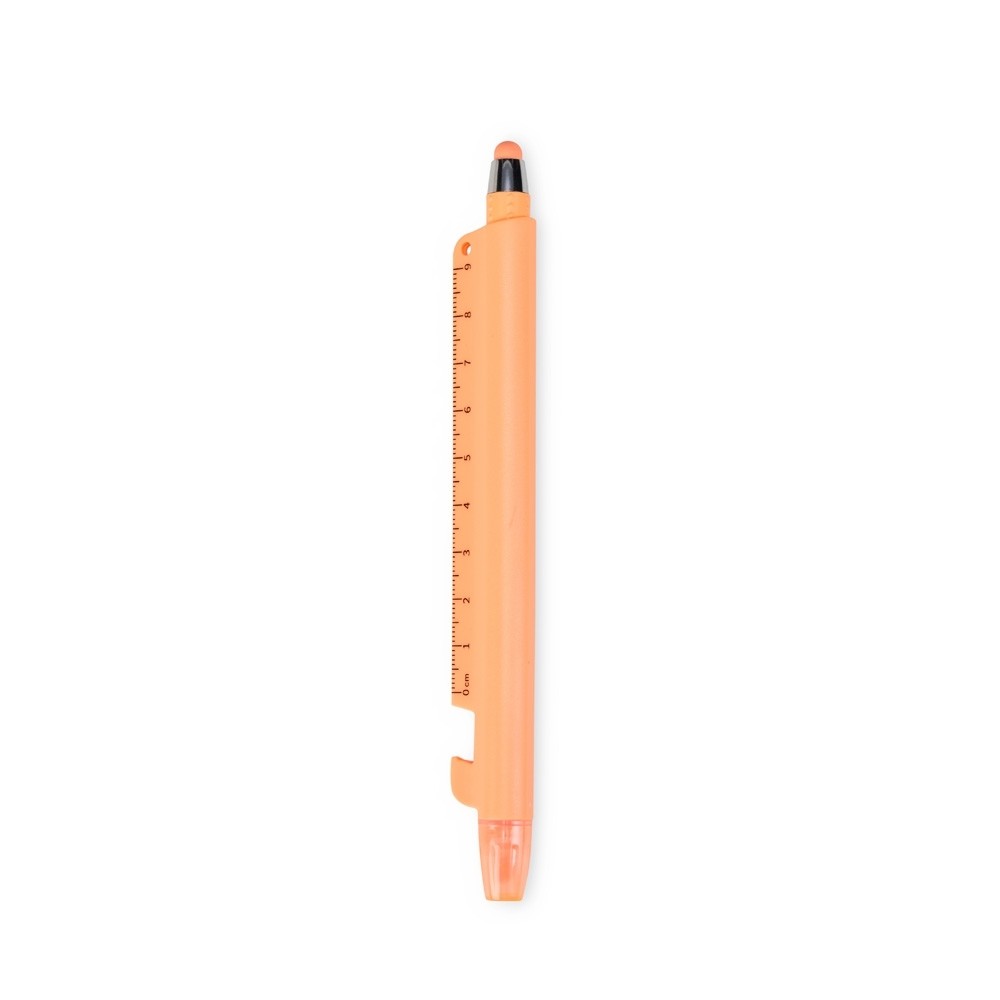 Caneta plástica marca-texto de ponta chanfrada com tampa protetora. Conta com uma régua de 9 centímetros e abridor de garrafas integrados ao corpo da caneta, além de uma caneta menor, destacável da estrutura principal, com ponteira emborrachada para interação com telas sensíveis ao toque e carga esferográfica azul de 1.0mm