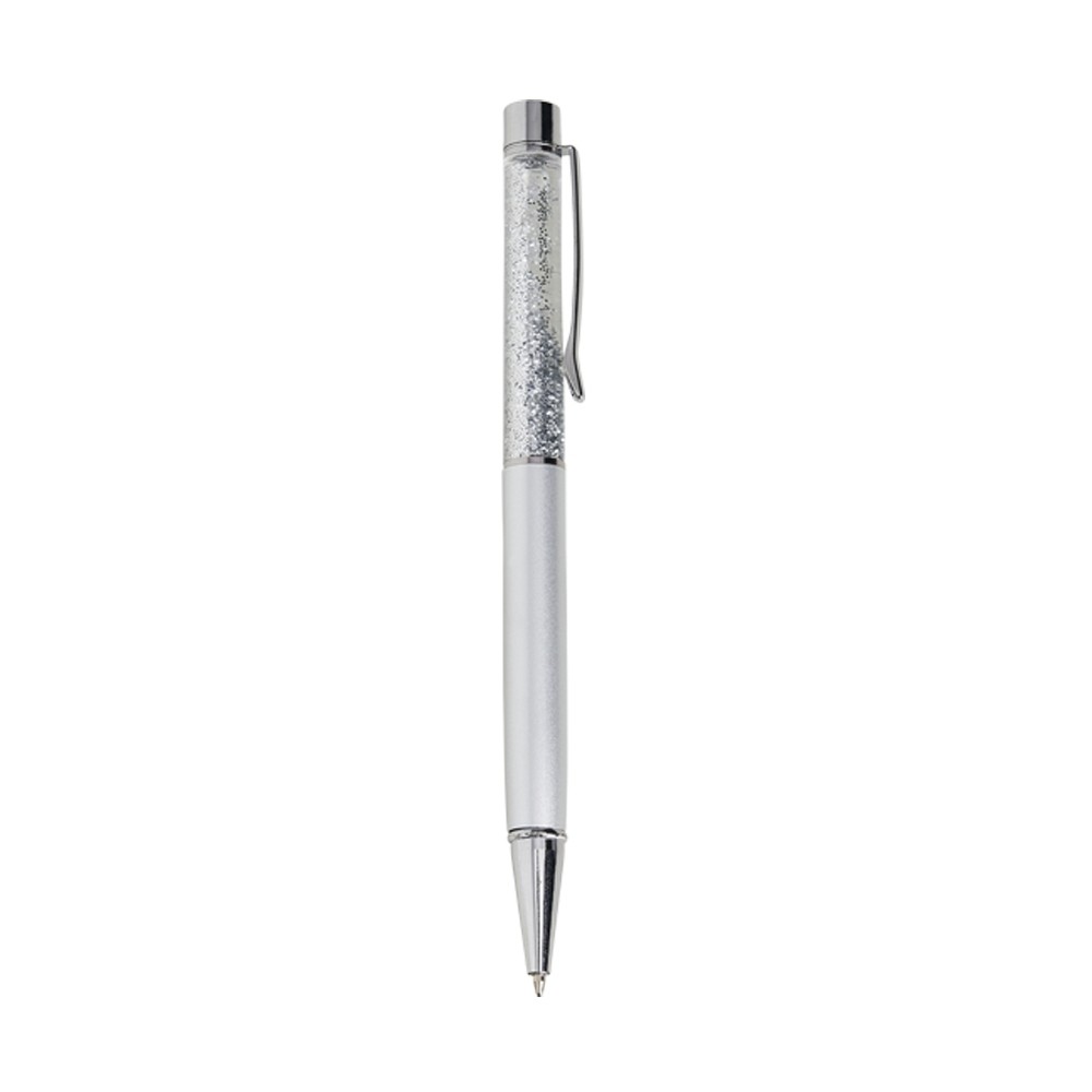 Caneta metálica com glitter, acionamento por rotação e carga esferográfica 1.0mm azul.