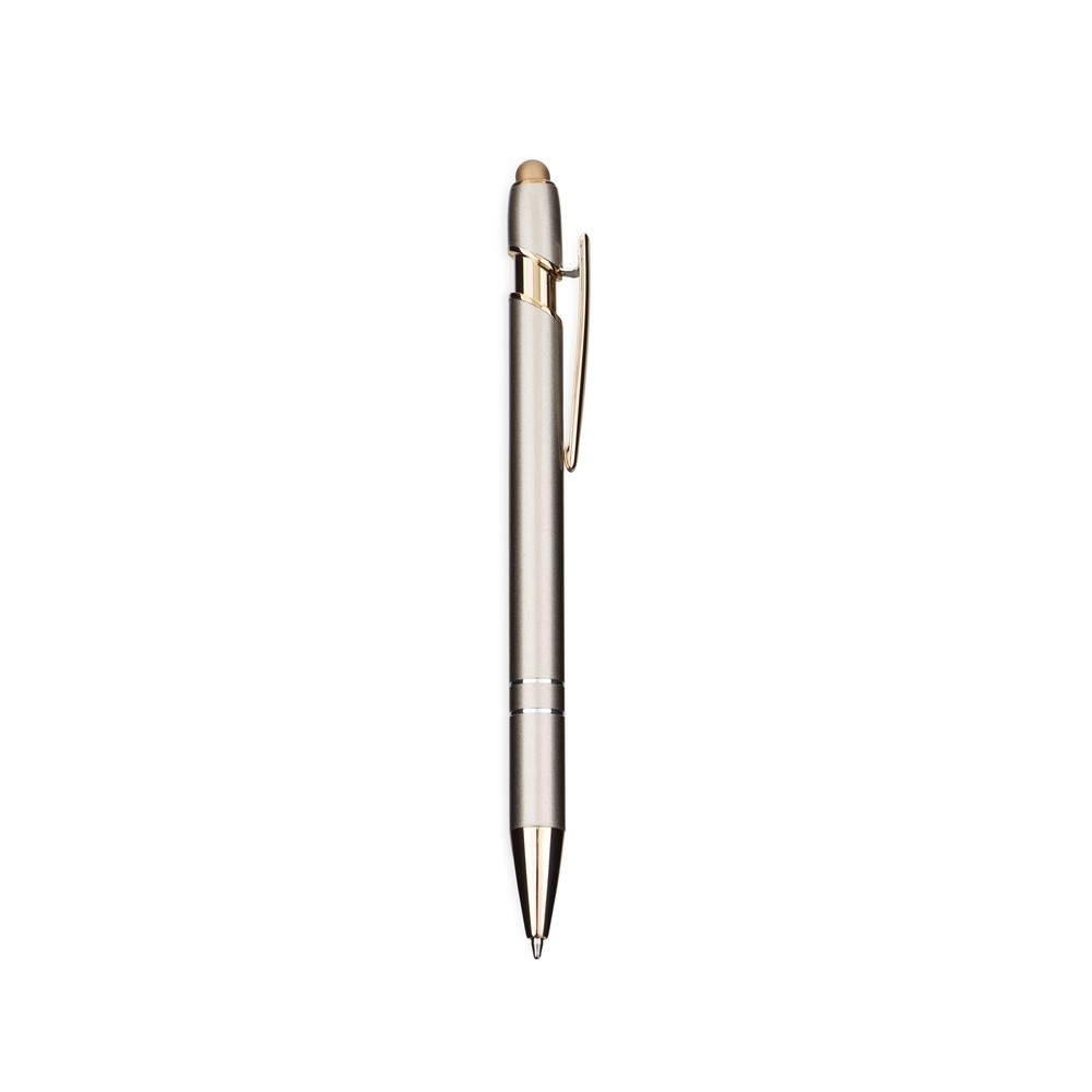 Caneta metálica com detalhe emborrachado no topo, ideal para interação com dispositivos de telas sensíveis ao toque. Possui acionamento por clique e carga esferográfica azul de 1,0mm.