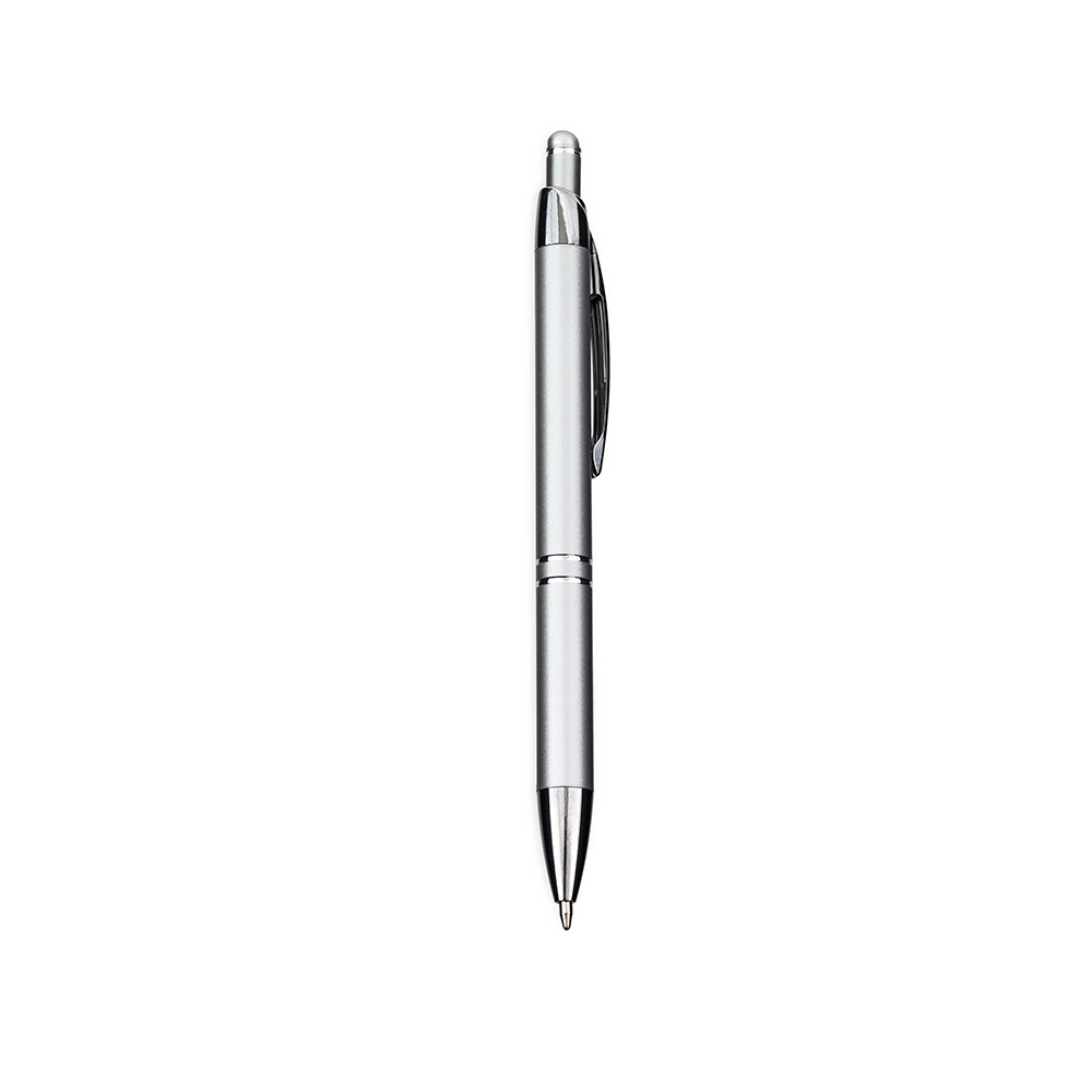 Caneta em metal com clip e ponta em plástico, além de detalhe emborrachado no topo para interação com dispositivos de telas sensíveis ao toque. Conta com acionamento por clique e carga esferográfica azul de 1,0mm.