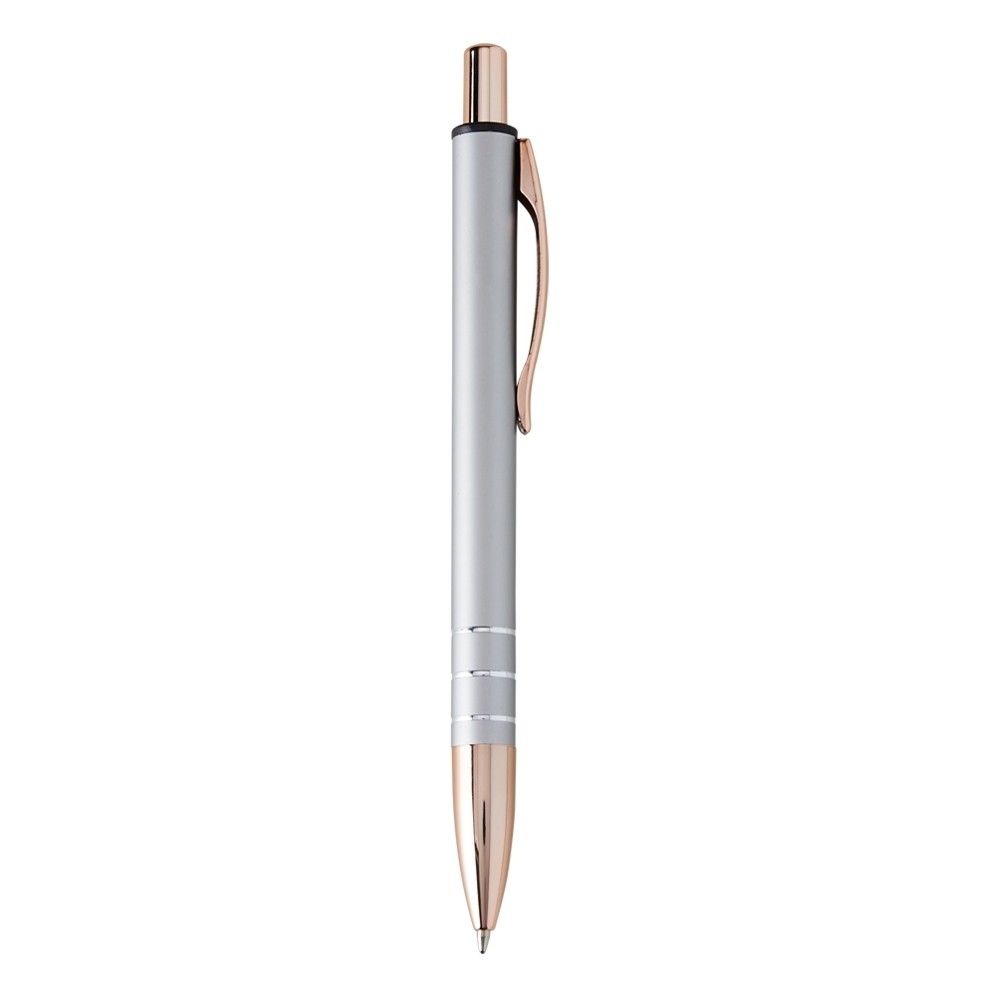 Caneta metálica com carga esferográfica azul 1.0mm e acionamento por clique.