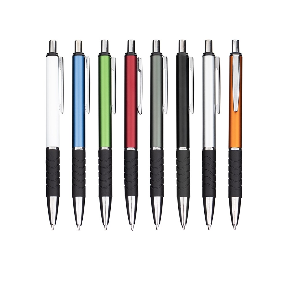 Caneta metálica com detalhe emborrachado próximo à ponta. Conta com acionamento por clique e carga esferográfica azul de 1.0mm.