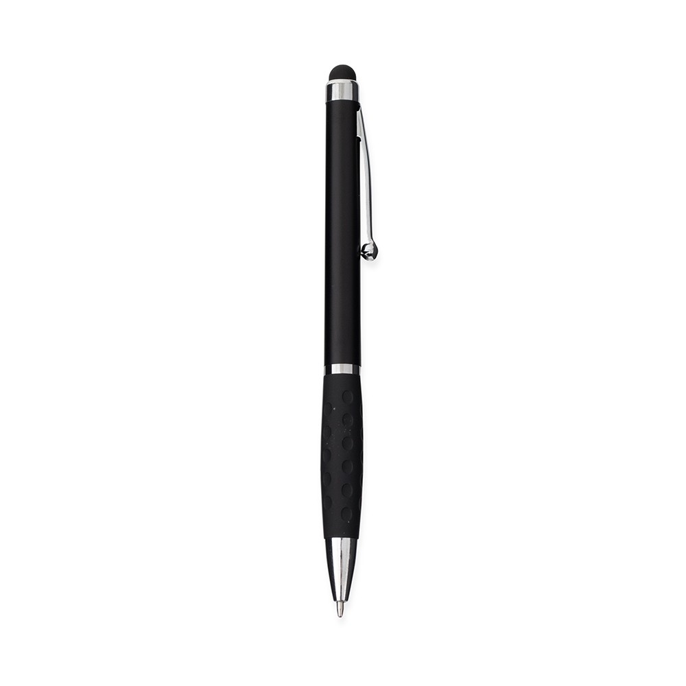 Caneta plástica com ponta, clip e pequenos detalhes em metal, além de detalhes ergonômicos na área próxima à tampa. Possui acionamento por rotação, carga esferográfica azul de 1.0mm e ponteira emborrachada para interação com dispositivos de telas sensíveis ao toque.