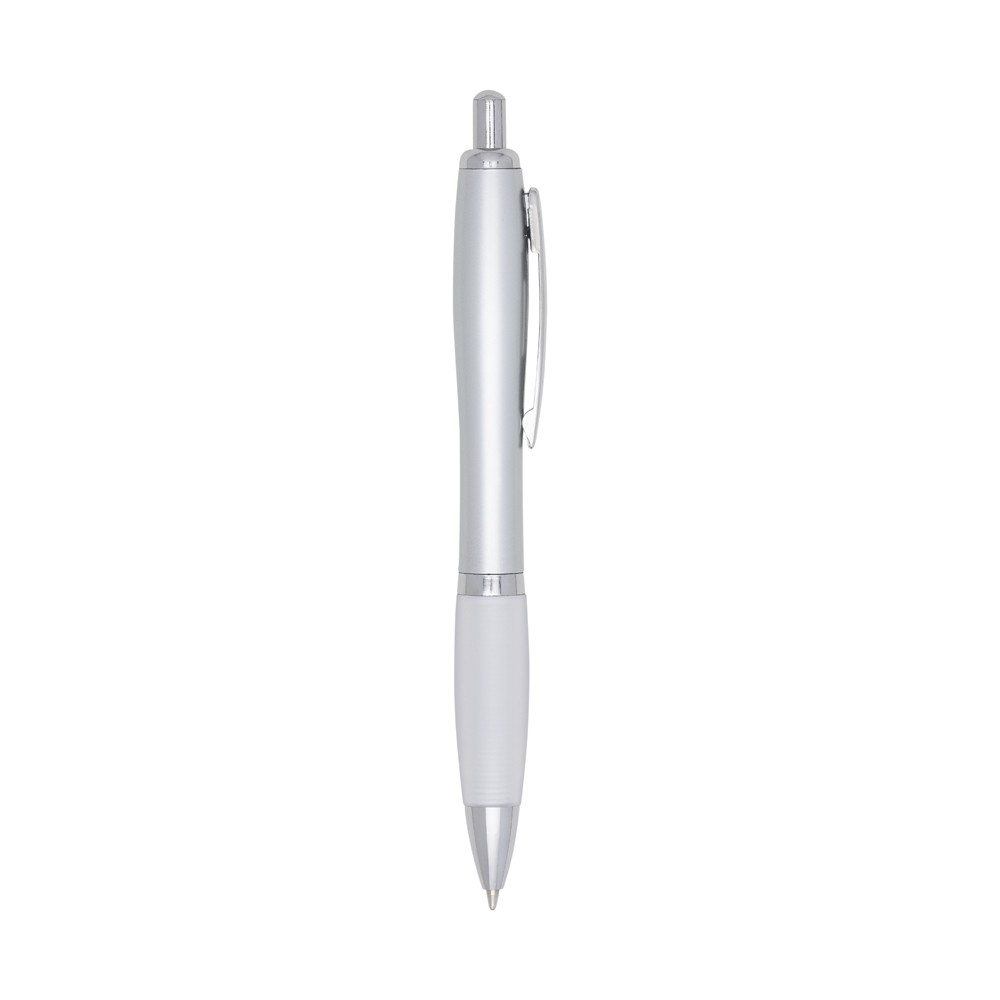 Caneta plástica com detalhe emborrachado, carga esferográfica azul 1.0 mm e acionamento por clique. Especificações: - Altura  14,4 cm - Largura  1,5 cm - Medidas aproximadas para gravação(CxL)  3,5 cm x 1,2 cm - Peso aproximado(g)  11