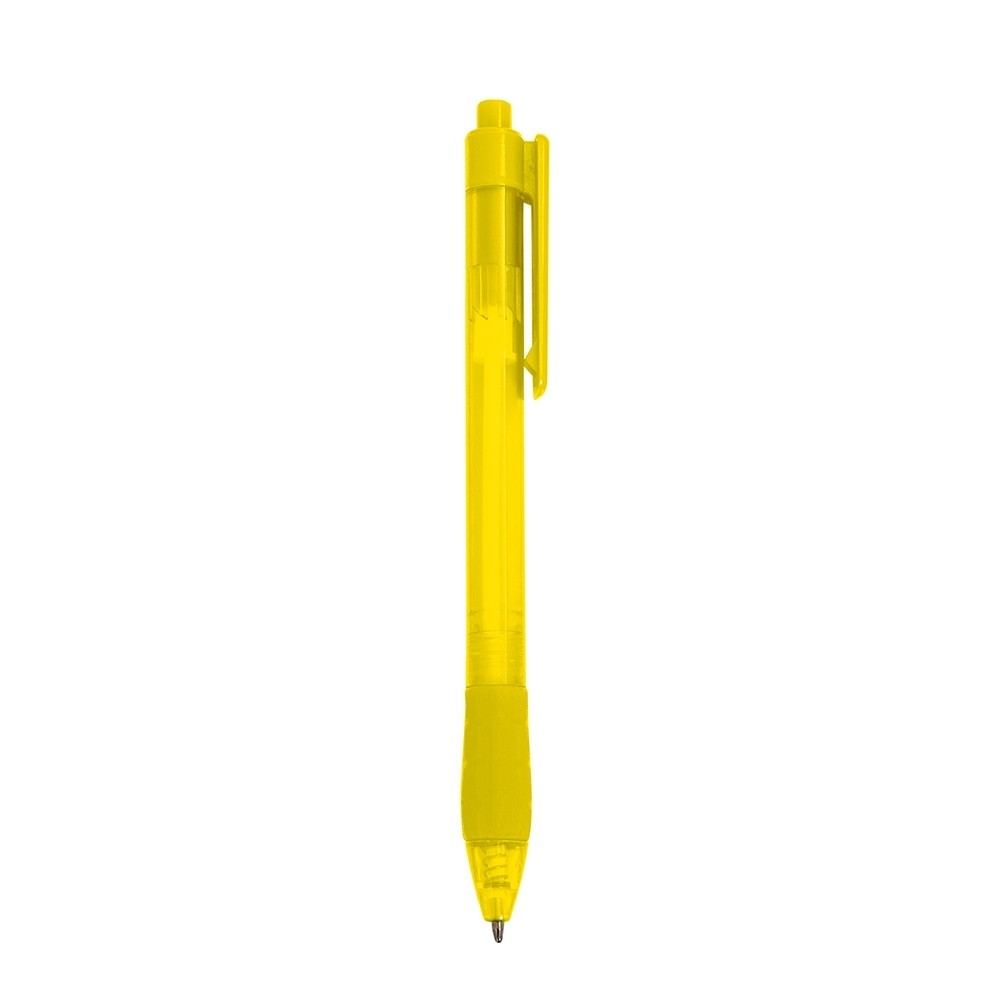 Caneta plástica com carga esferográfica azul 1.0 e acionamento por clique.