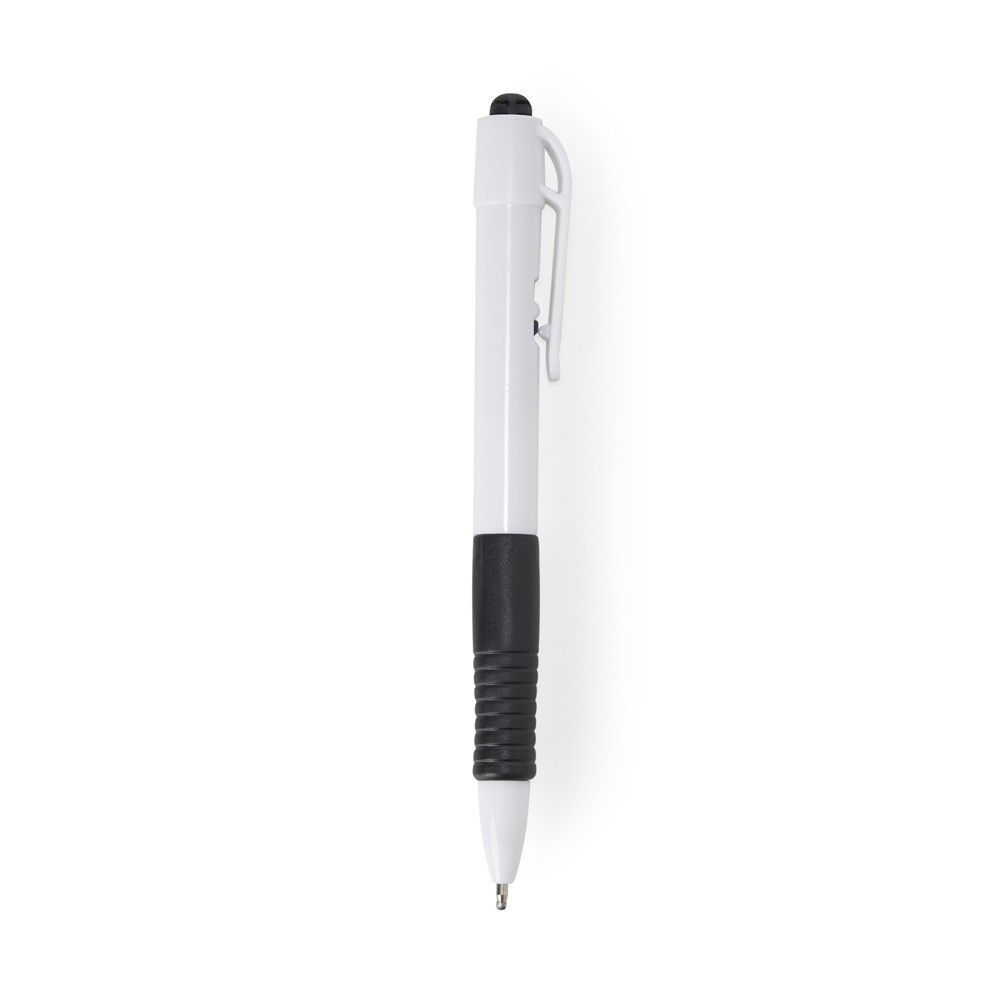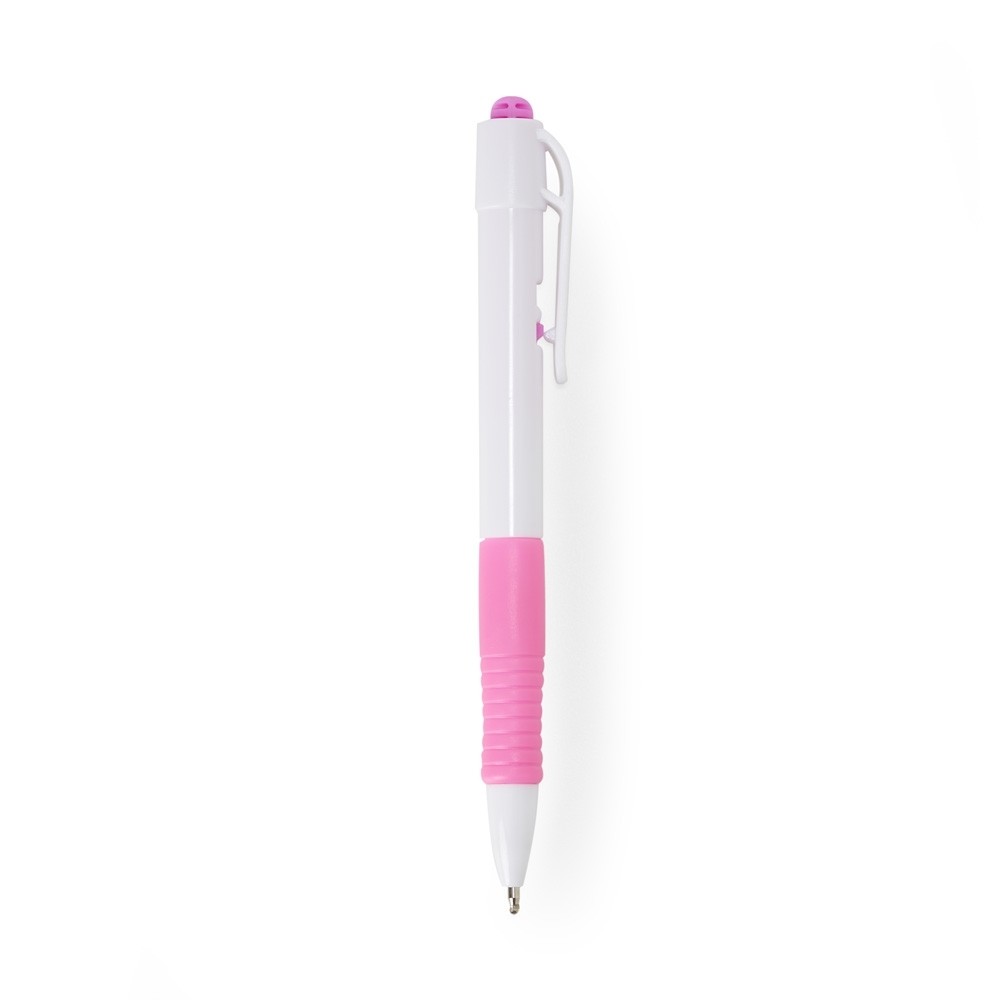 Caneta plástica com detalhe emborrachado, carga esferográfica azul 1.0 mm e acionamento por clique.