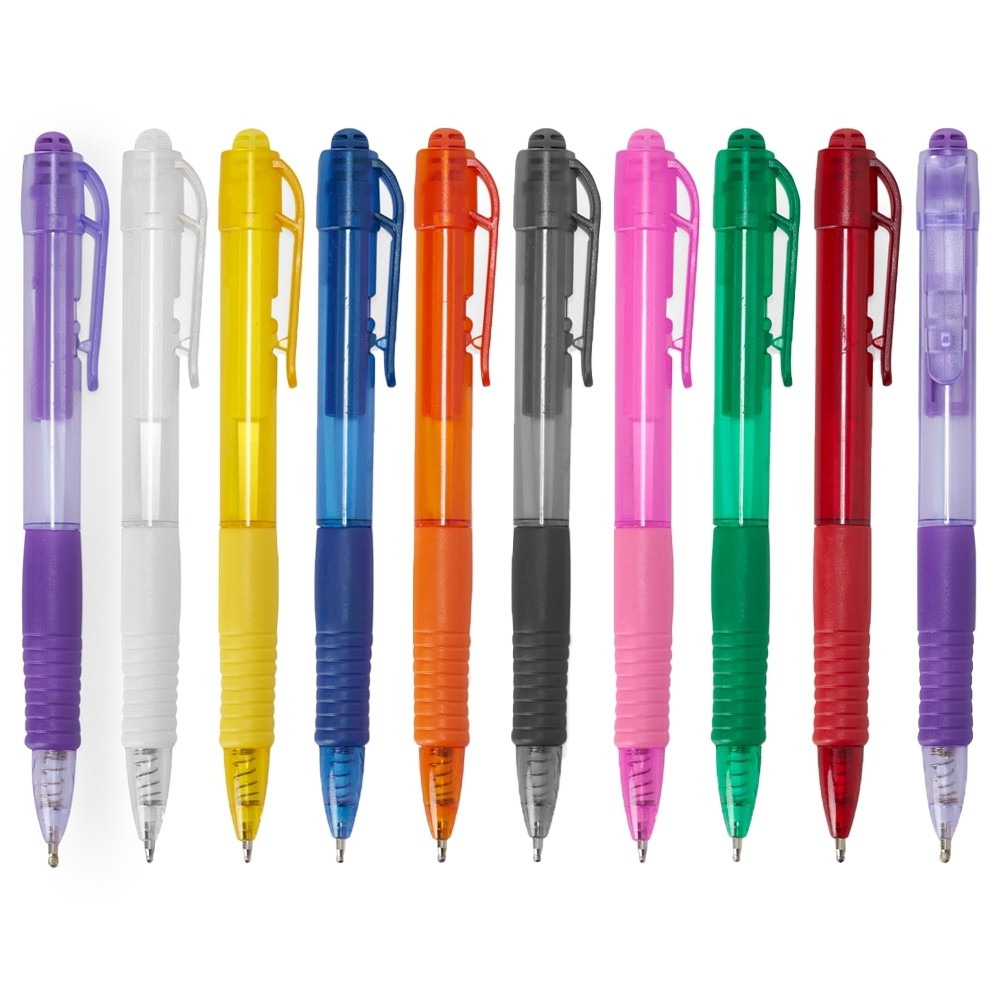 Caneta plástica com detalhe emborrachado, carga esferográfica azul 1.0 mm e acionamento por clique.