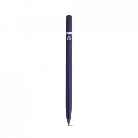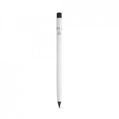 Caneta sem tinta em alumínio 100% reciclado, com tampa protetora em PE 100% reciclado e ponta de grafite. Apta para um uso prolongado sem a necessidade de apontar. Na parte superior contém uma borracha que apaga com facilidade o que está escrito. ø8 x 150 mm