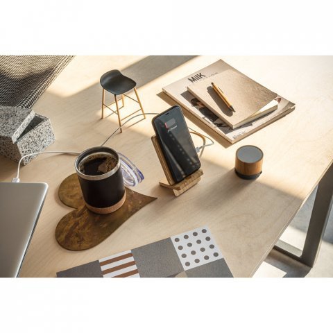 Carregador por indução (wireless) super-rápido e suporte em bambu para smartphone. Possui uma potência de carregamento sem fios máxima de 15W. Compatível com smartphones com tecnologia de carregamento sem fios. O suporte em bambu consiste em 2 partes desmontadas. Incluso cabo USB-C de 1 metro. Fornecido em caixa presente de papel kraft reciclado. A cor e o resultado da impressão nos materiais naturais pode variar entre produtos. 140 x 80 x 8 mm