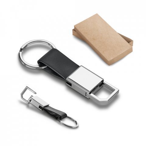 Chaveiro em c. sintético e metal com mosquetão. Fornecido em caixa presente de papel kraft reciclado. 21 x 77 x 8 mm