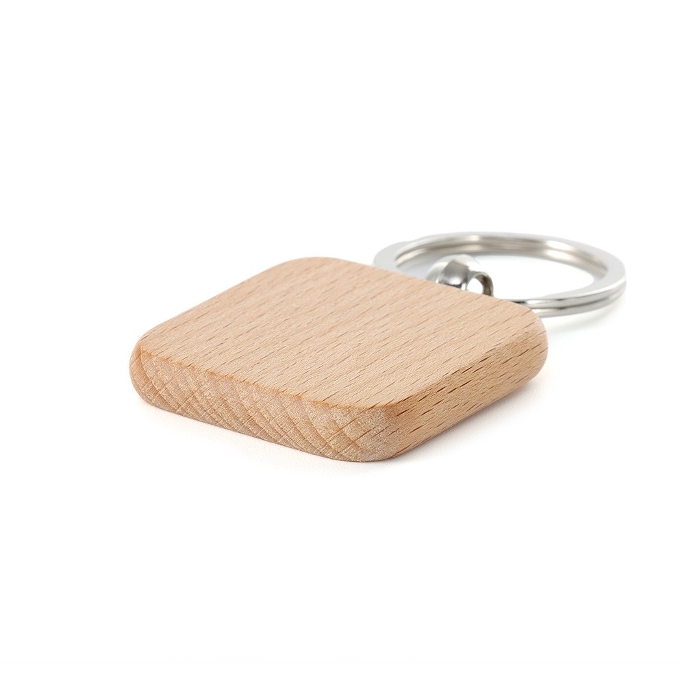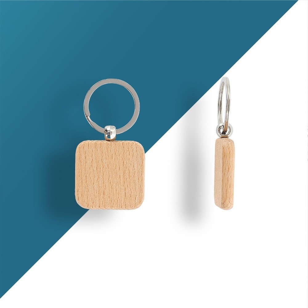 Chaveiro em madeira com formato quadrado e argola de metal.