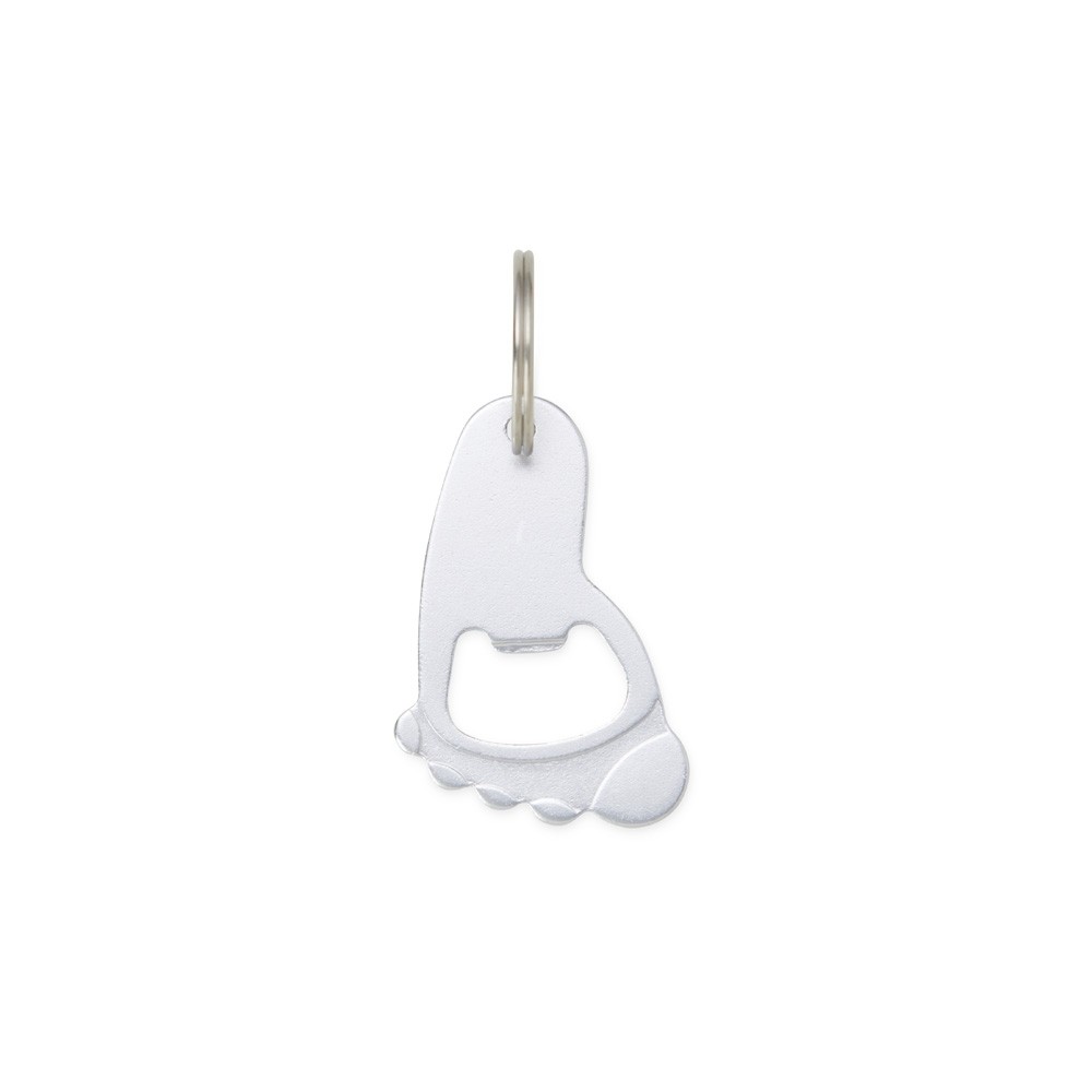 Chaveiro abridor de garrafas em metal com um formato que remete a um pé e argola de ferro niquelado.