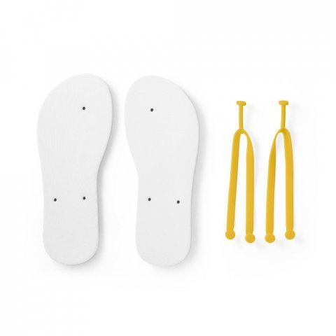Chinelos confortáveis com sola em EVA e tira em PVC. A sola é totalmente personalizável em sublimação. Tamanhos disponíveis: G/GG (40 ao 43). Fornecidos num saco (montados em caso de personalização e desmontados em caso de não personalização). G/GG