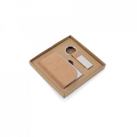 Conjunto composto por um porta-cartões e um chaveiro, ambos em metal e cortiça. O porta-cartões tem capacidade até 7 cartões. Fornecido em caixa presente de papel kraft reciclado. A cor e o resultado da impressão nos materiais naturais pode variar entre produtos. Chaveiro: 25 x 115 x 6 mm | Porta-cartões: 95 x 65 x 15 mm | Caixa: 125 x 135 x 17 mm