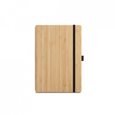 Conjunto de caderno A5 e esferográfica em bambu. O caderno de capa e contracapa em placa de bambu e lombada em poliéster 100% reciclado, contém 192 páginas pautadas em papel 100% reciclado, suporte para esferográfica (inclusa) e elástico para fecho do caderno. Esferográfica em bambu e escrita em preto. Fornecido em caixa presente de oferta de papel kraft reciclado. A cor e o resultado da impressão nos materiais naturais pode variar entre produtos. Caderno: 140 x 210 mm | Esferográfica: ø11 x 138 mm | Caixa de oferta: 160 x 255 x 18 mm
