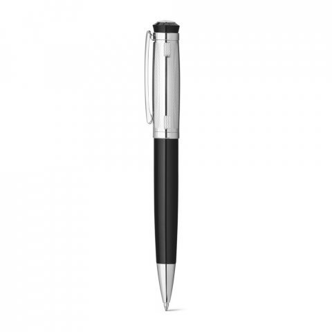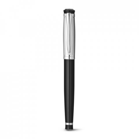 Conjunto de roller e esferográfica sofisticada, em ferro com acabamento brilhante preto e tampa cromada com clipe de ferro. Escrita em azul até 1,5 km. Fornecido em estojo presente almofadado. Esferográfica: ø13 x 136 mm | Roller: ø13 x 135 mm | Caixa: 192 x 34 x 85 mm