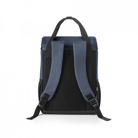 Mochila térmica almofadada em 600D ripstop em poliéster reciclado com interior forrado em PEVA 16 L Mochila térmica almofadada em ripstop poliéster reciclado 600D. É composta por dois correias frontais que facilitam no transporte de objetos, um compartimento principal espaçoso com fecho duplo, dois bolsos laterais em tela mesh para pequenos objetos e alças ajustáveis para assegurar um maior conforto no transporte. O interior forrado em PEVA garante um bom isolamento térmico permitindo a conservação do frio por mais tempo e a sua higienização. A robustez dos materiais que a compõe conferem-lhe uma grande resistência e durabilidade, pensado para as necessidades do cotidiano. Capacidade até 16 L. Certificação EU Food Grade. 280 x 400 x 160 mm