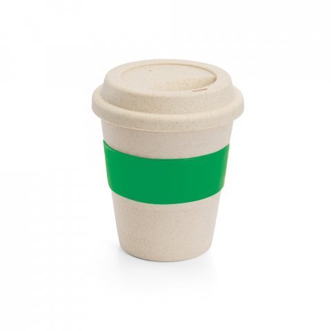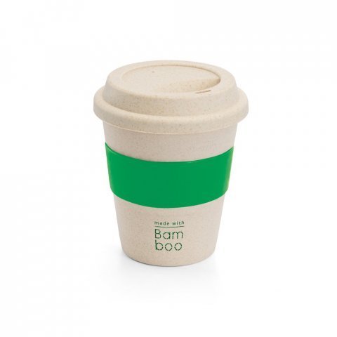 Copo de viagem em fibra de bambu (60%) e PP (40%) com tampa. Tira em silicone para facilitar o transporte de bebidas quentes. Capacidade até 380 mL Certificação EU Food Grade. ø95 x 114 mm