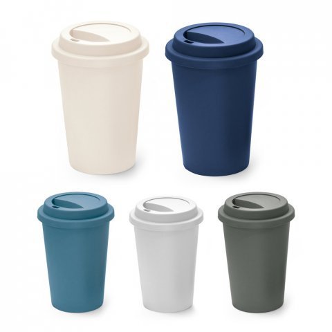 Copo em fibra de arroz biodegradável com capacidade para até 350ml e tampa plástica rosqueável. Especificações: - Altura  11 cm - Largura  9 cm - Circunferência  25 cm - Medidas aproximadas para gravação(CxL)  8 cm x 8 cm - Tamanho total aproximado(CxL)  Diâmetro 8,5 cm - Peso aproximado(g)  56