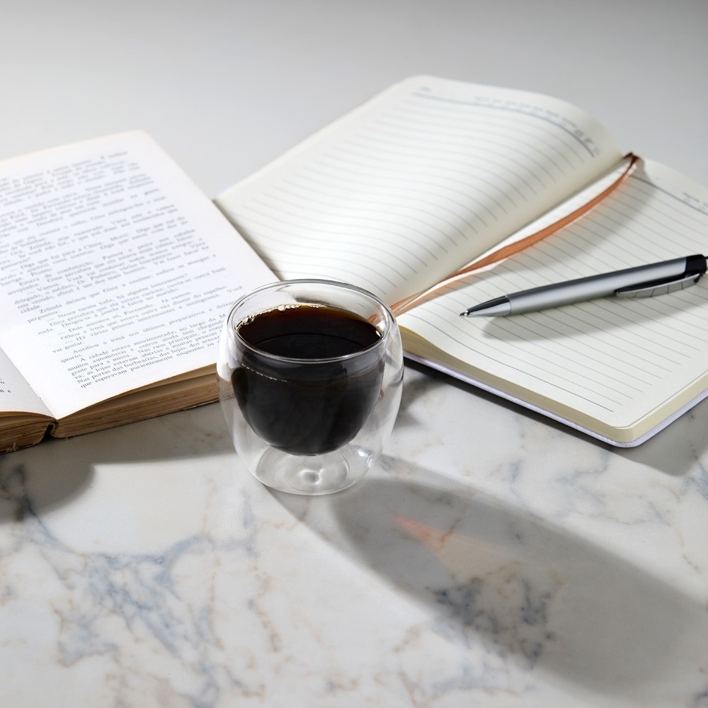 Copo de vidro borossilicato parede dupla com capacidade para 160ml. Especificações: - Altura  7,7 cm - Largura  8,4 cm - Circunferência  26,3 cm - Medidas aproximadas para gravação(CxL)  3 cm x 2 cm - Peso aproximado(g)  84