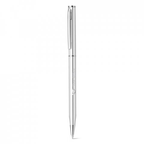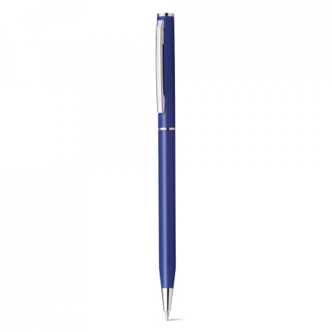 Esferográfica em alumínio com mecanismo twist e clipe de metal. Escrita em azul até 1,5 km. ø7 x 129 mm