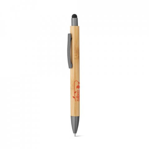 Esferográfica em bambu com clipe em metal e acabamento mate. A esferográfica tem ponteira touch e escrita em preto até 1,5 km. A cor e o resultado da impressão nos materiais naturais pode variar entre produtos. Ø11 x 141 mm