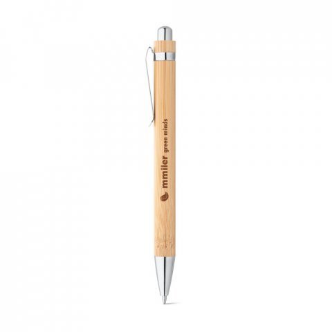 Esferográfica em bambu com clipe de metal. Escrita em azul até 1,5 km. A cor e o resultado da impressão nos materiais naturais pode variar entre produtos. ø11 x 138 mm