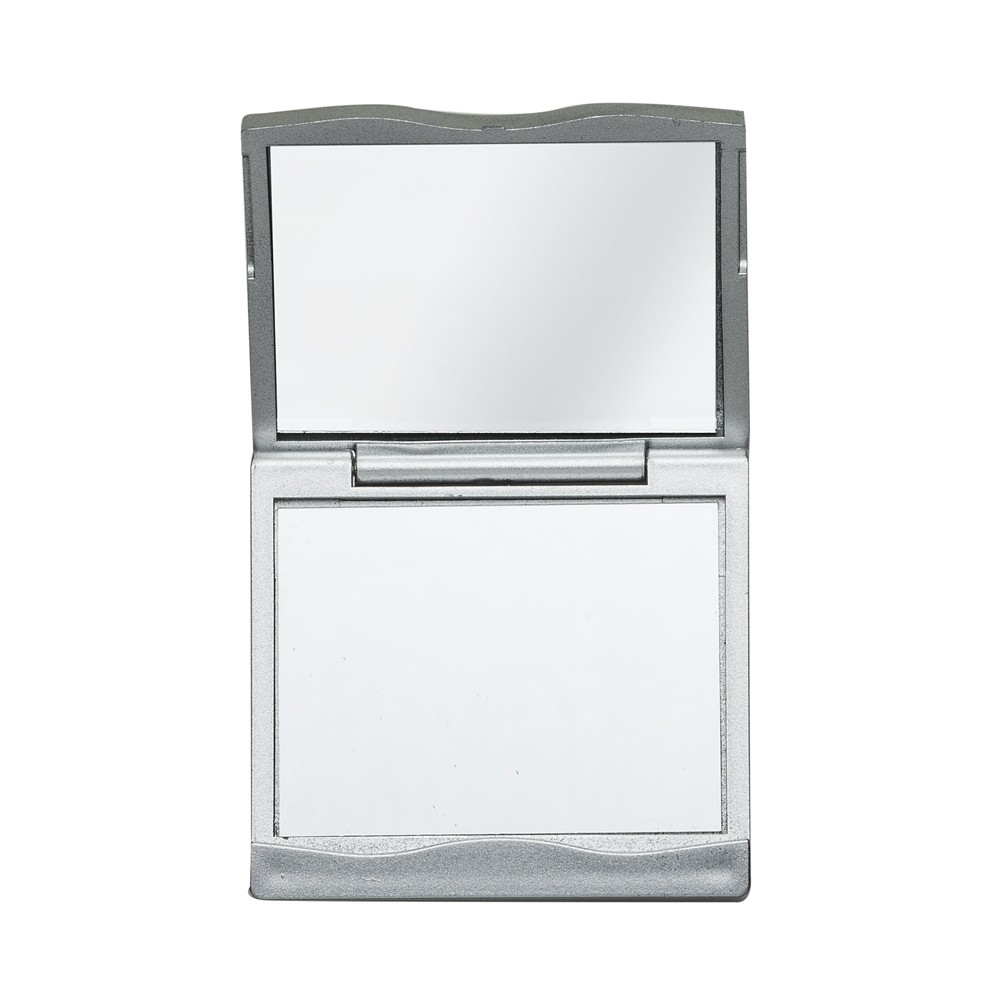 Espelho duplo compacto com moldura em plástico, detalhe ondulado na área da abertura e tampa de formato curvo. Possui dois espelhos: o superior sem aumento e o inferior com aumento. Especificações: - Largura  6,7 cm - Comprimento  6,8 cm - Espessura  1,2 cm - Medidas aproximadas para gravação(CxL)  5 cm x 6,5 cm - Peso aproximado(g)  46