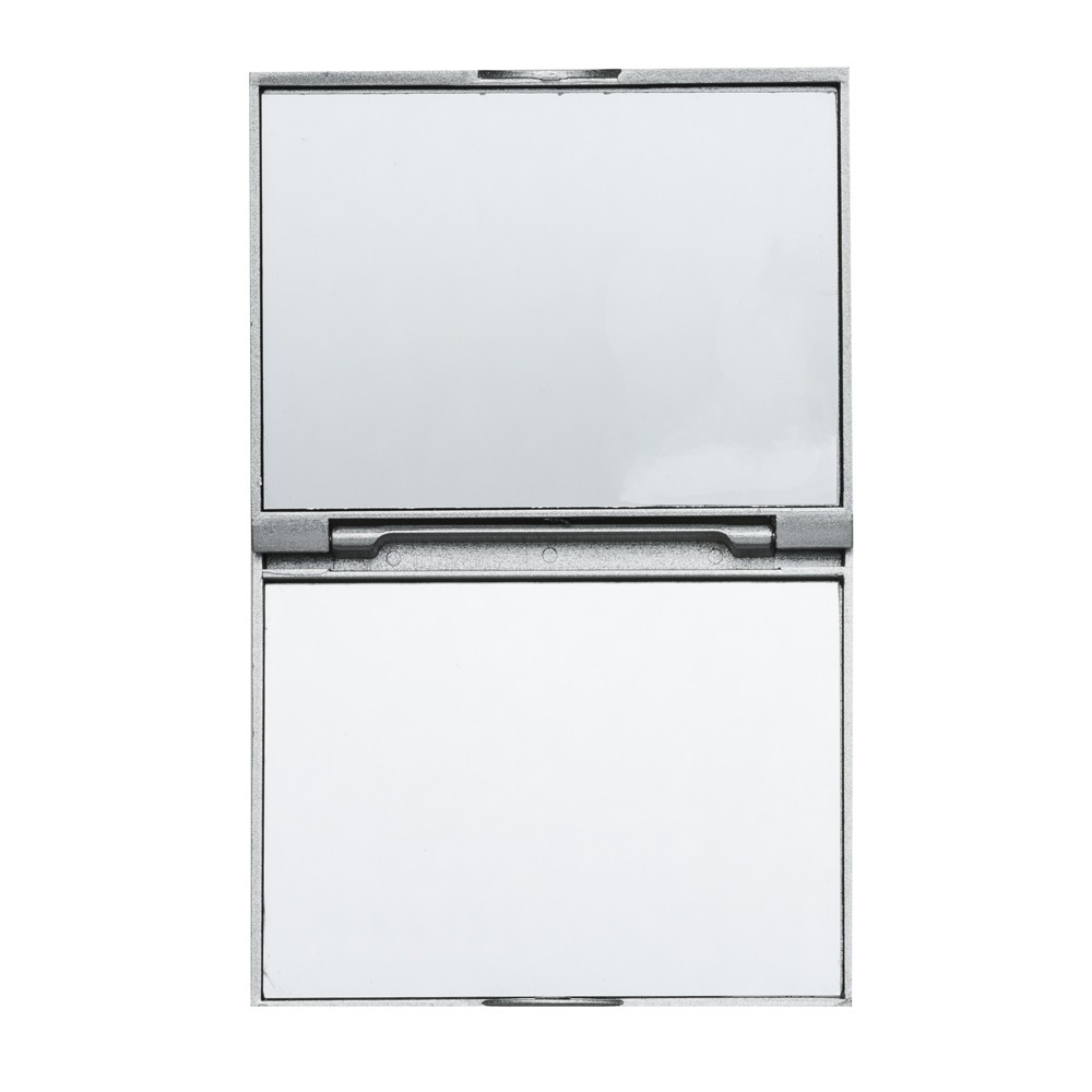 Espelho retangular duplo sem aumento, material em plástico resistente com uma faixa na superfície e verso liso.