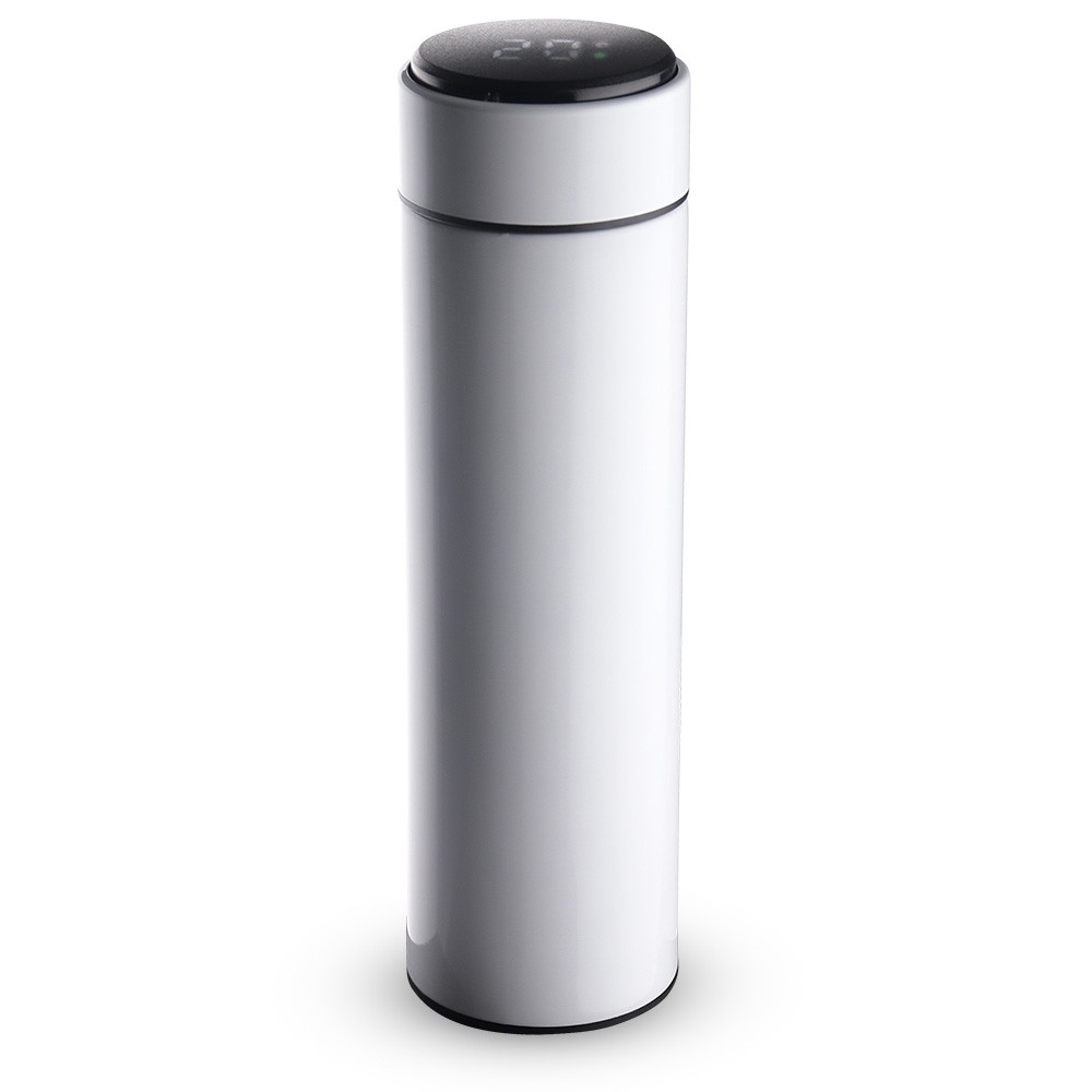 Garrafa inox 450ml com parede dupla, infusor e display LED com termômetro digital na tampa para indicar a temperatura do líquido. Conserva temperatura quente ou fria.